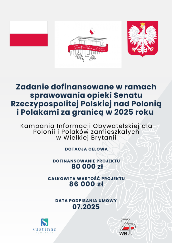 realizowany przez Fundację Sustinae i Zjednoczenie Polskie w Wielkiej Brytanii w ramach Priorytetu 3. Realizacji zadań publicznych w zakresie opieki nad Polonią i Polakami za granicą w roku 2025 określony Uchwałą nr 17 Prezydium Senatu z dnia 14 listopada 2024 r.: Wspieranie aktywności obywatelskiej Polaków mieszkających za granicą, w tym edukacji obywatelskiej oraz zaangażowania Polonii w lokalne struktury społeczno-polityczne w krajach zamieszkania.